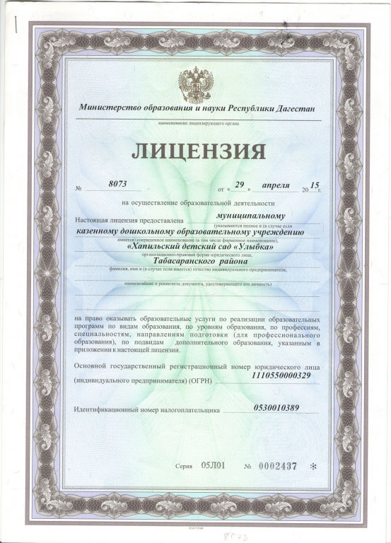 | Полное наименование образовательной организации* | Муниципальное казенное дошкольное образовательное учреждение "Хапильский детский сад"Улыбка" |